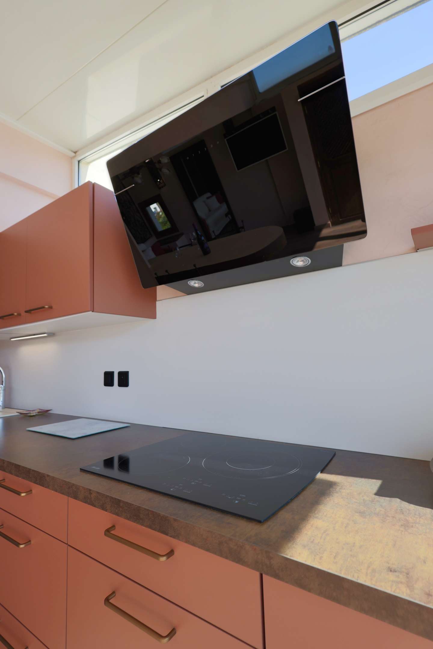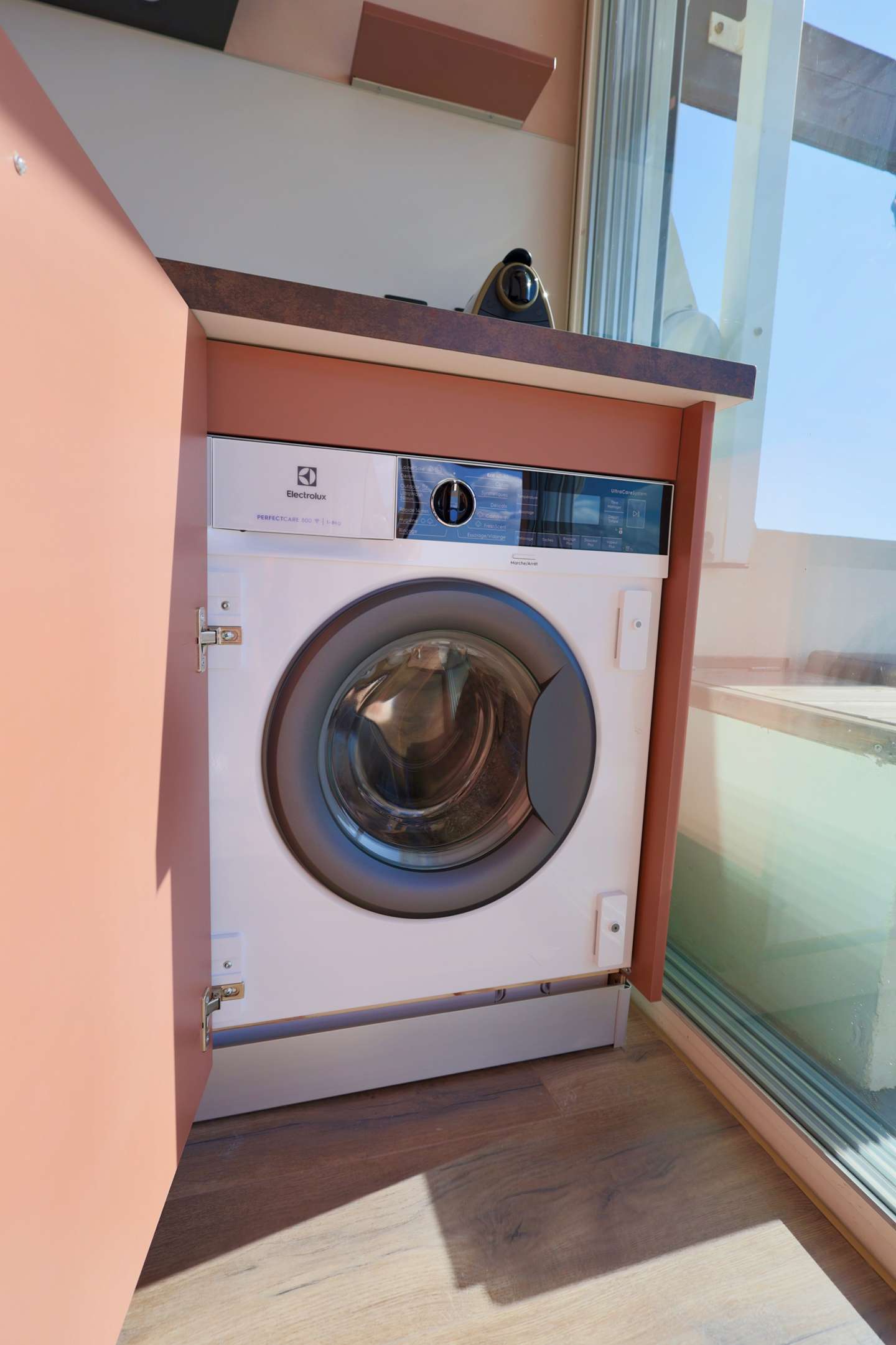 Voll ausgestattete Küche mit Induktionskochfeld, Kühlschrank, Mikrowelle, Nespresso-Kaffeemaschine, Geschirrspüler und Waschmaschine.