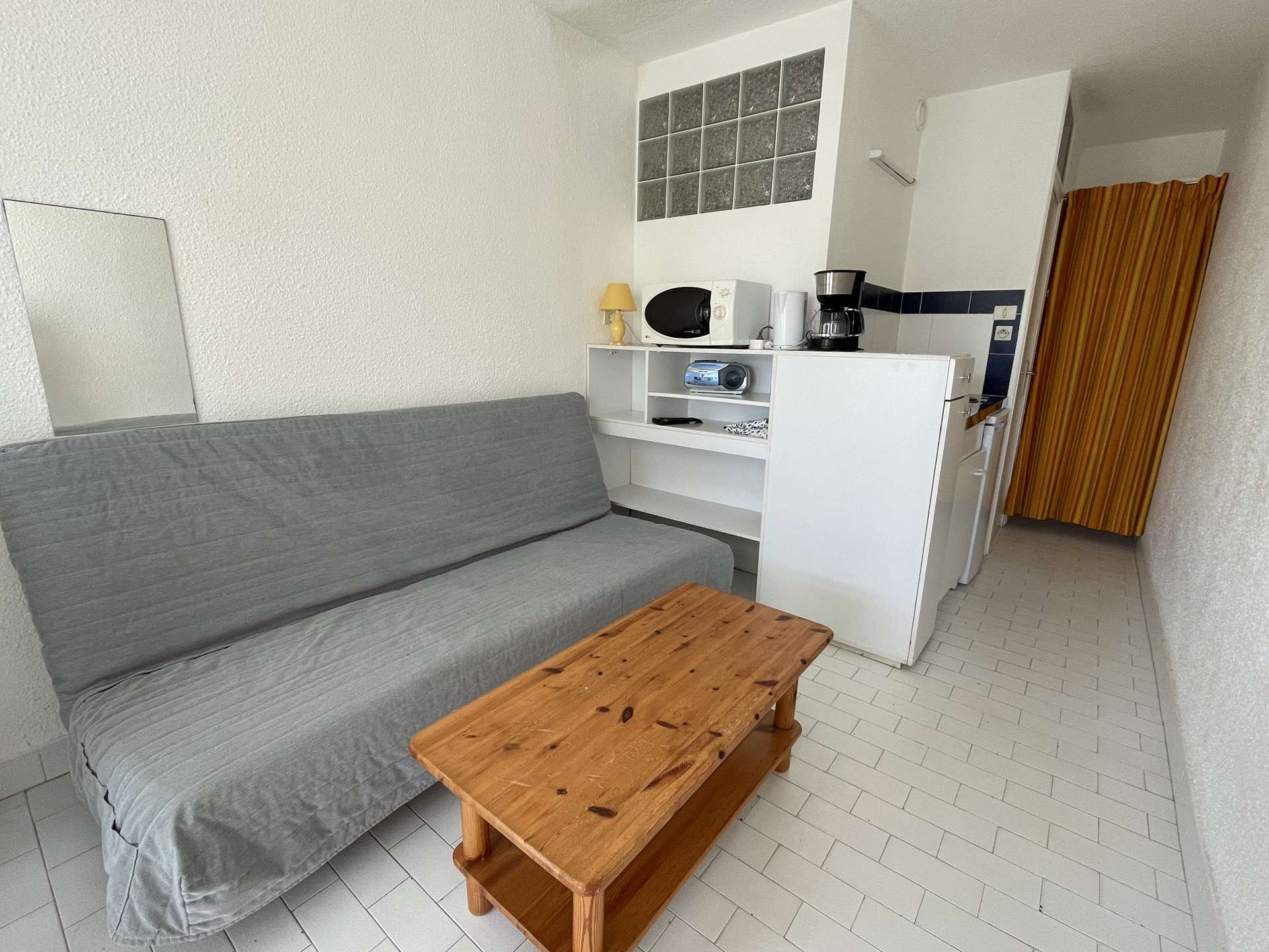 Pièce principale avec canapé clic-clac, TV.