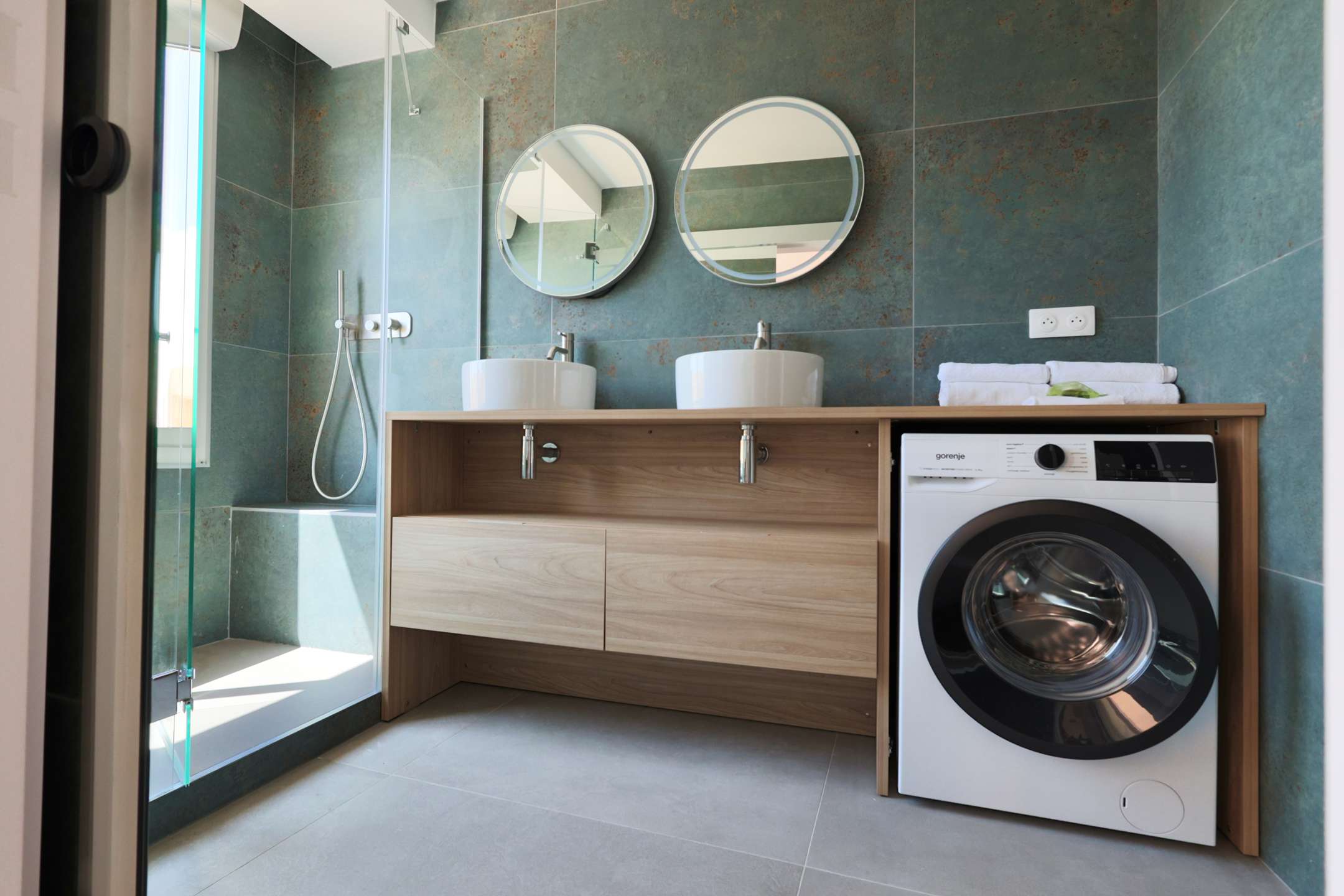 Salle de bains avec douche, meuble vasque, lave-linge.