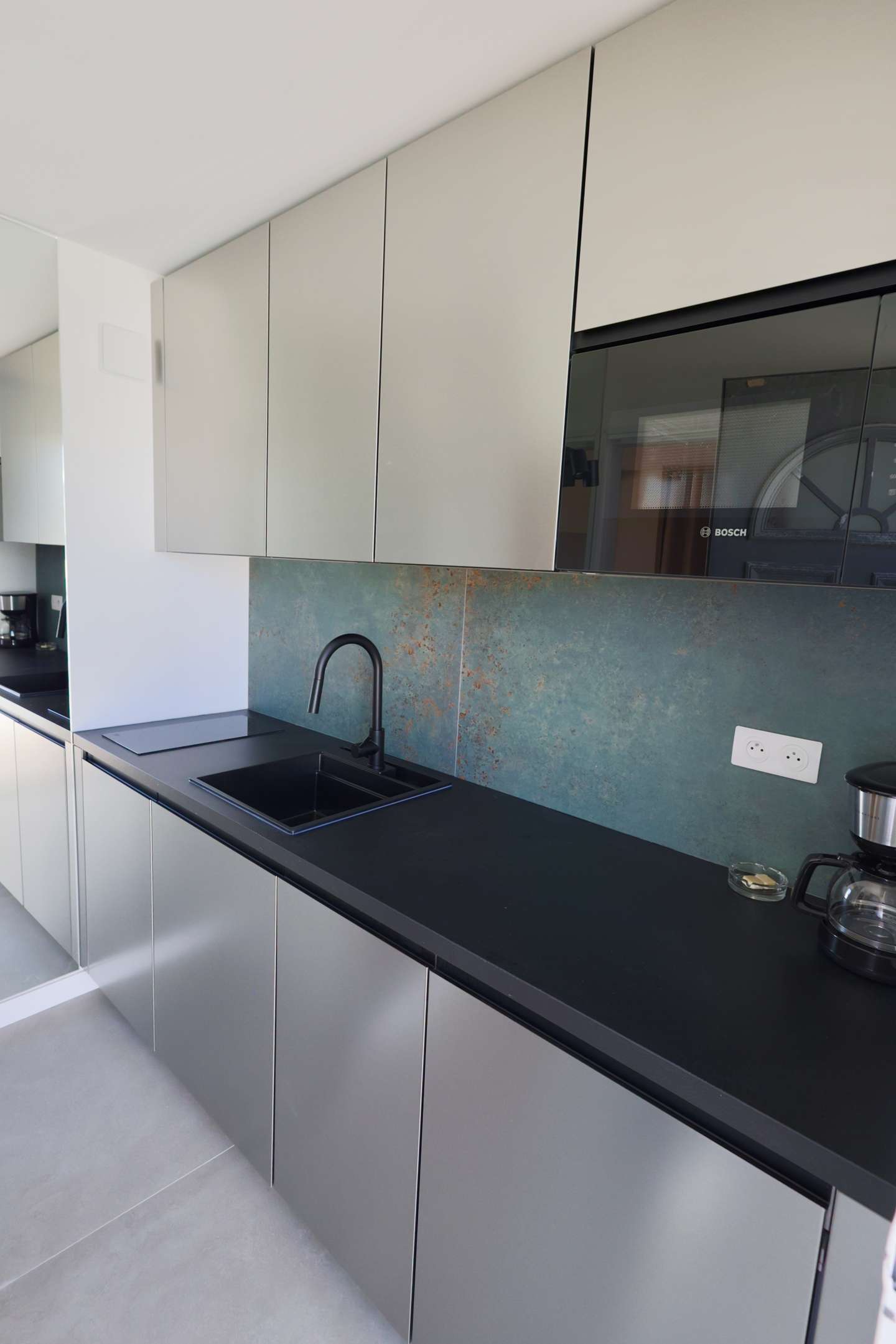 Coin cuisine équipé : plaque vitrocéramique, lave-vaisselle, réfrigérateur,