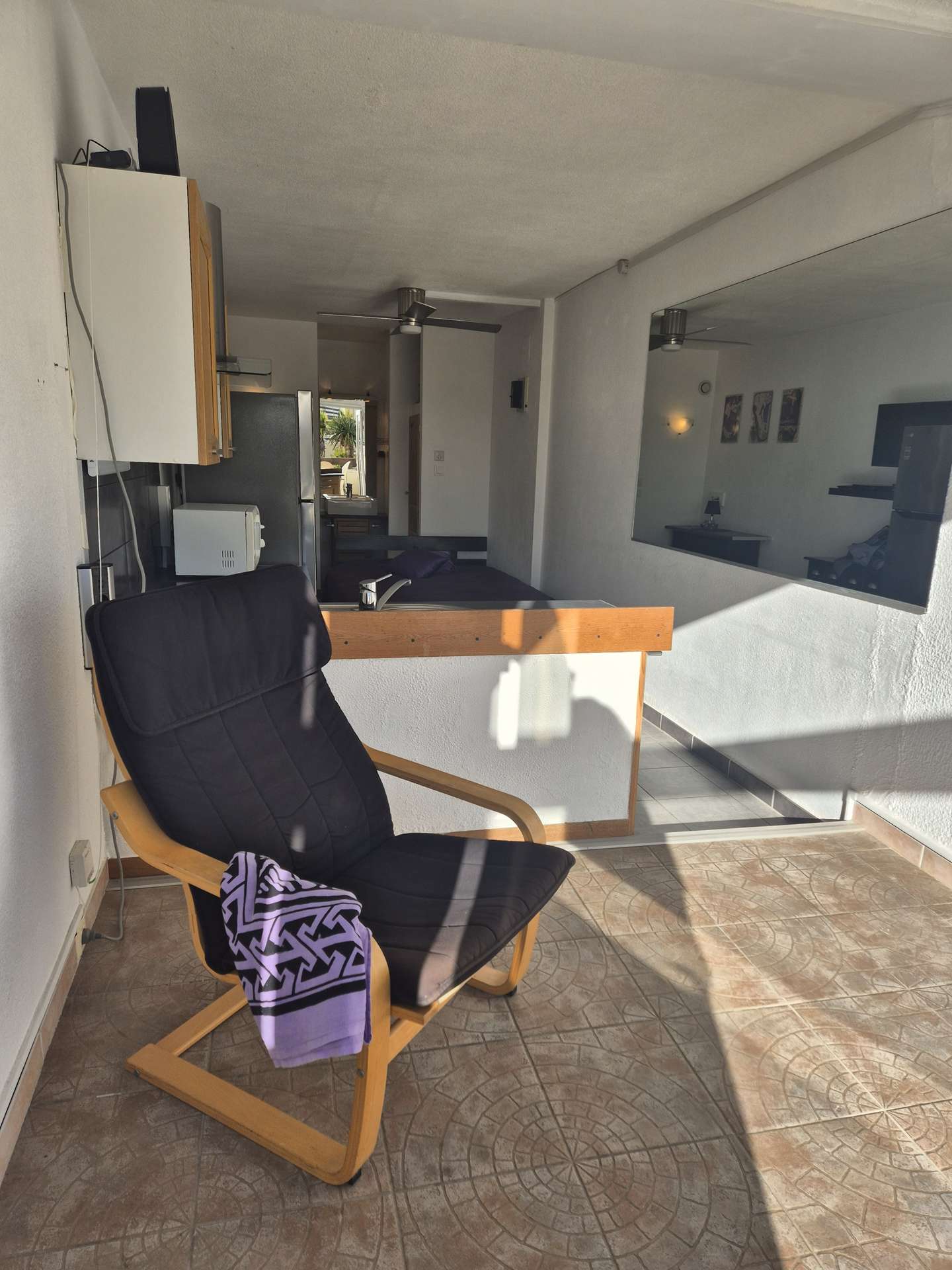 Séjour avec lit double (140 cm) et TV.
