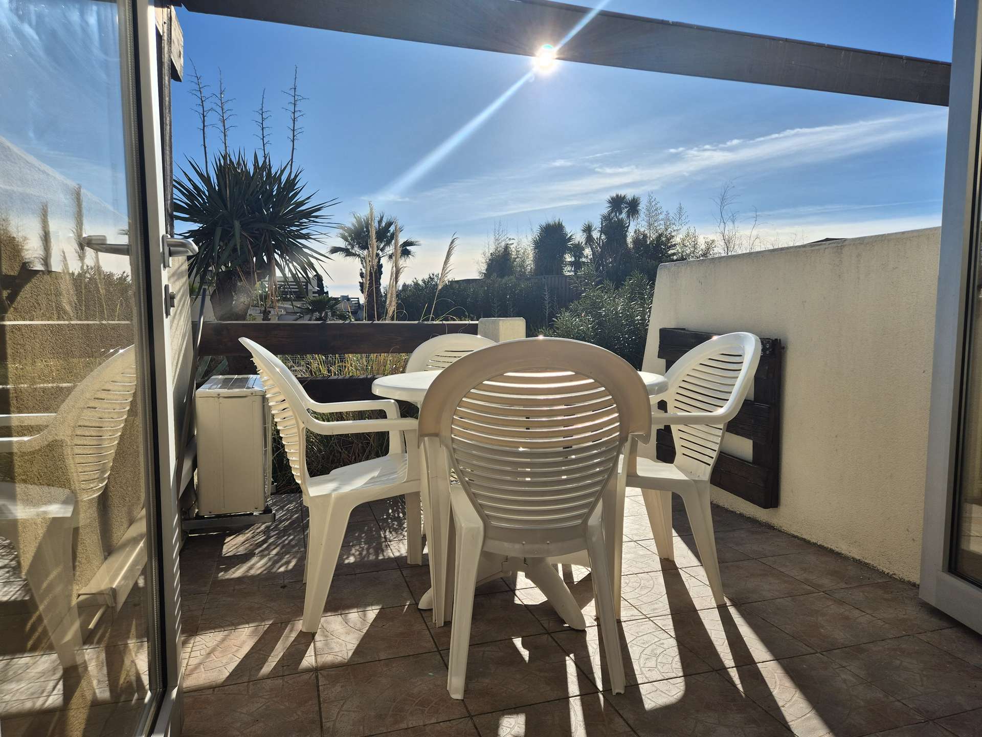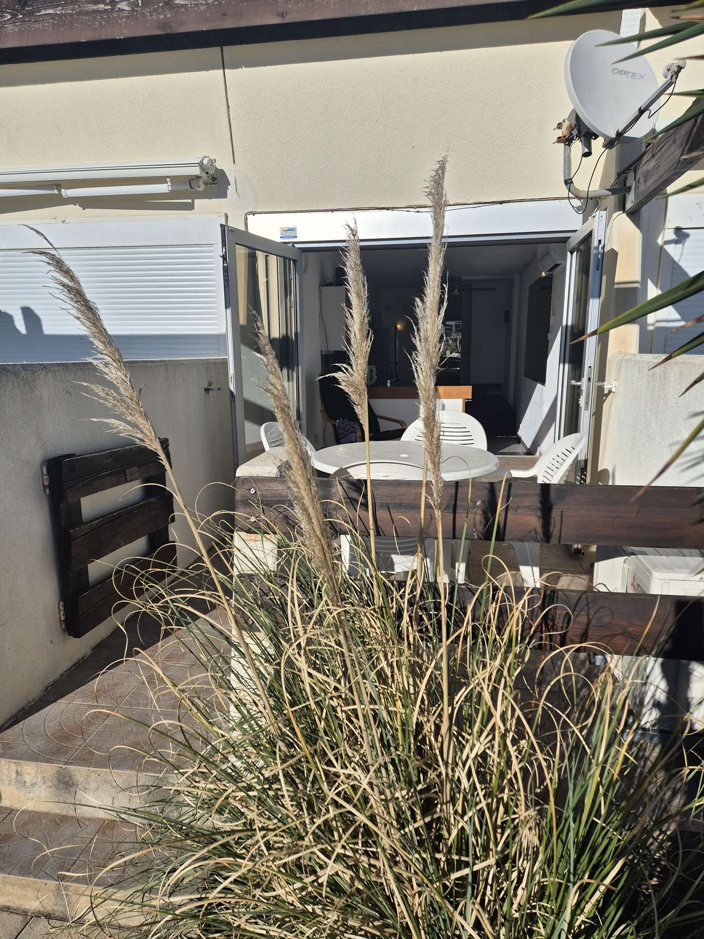 Terrasse avec salon de jardin et store.