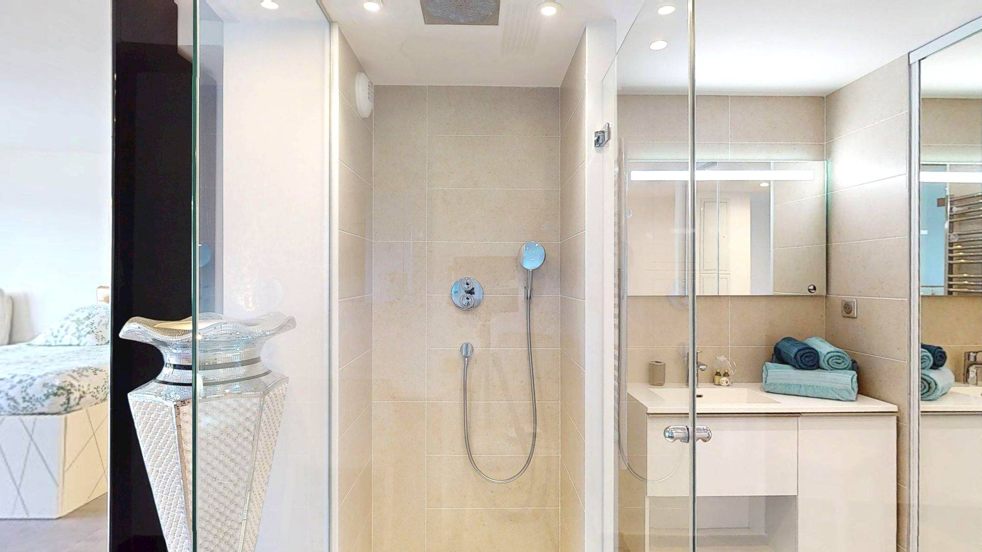Bagno con ampia doccia a filo pavimento con soffione a pioggia e mobile lavabo.