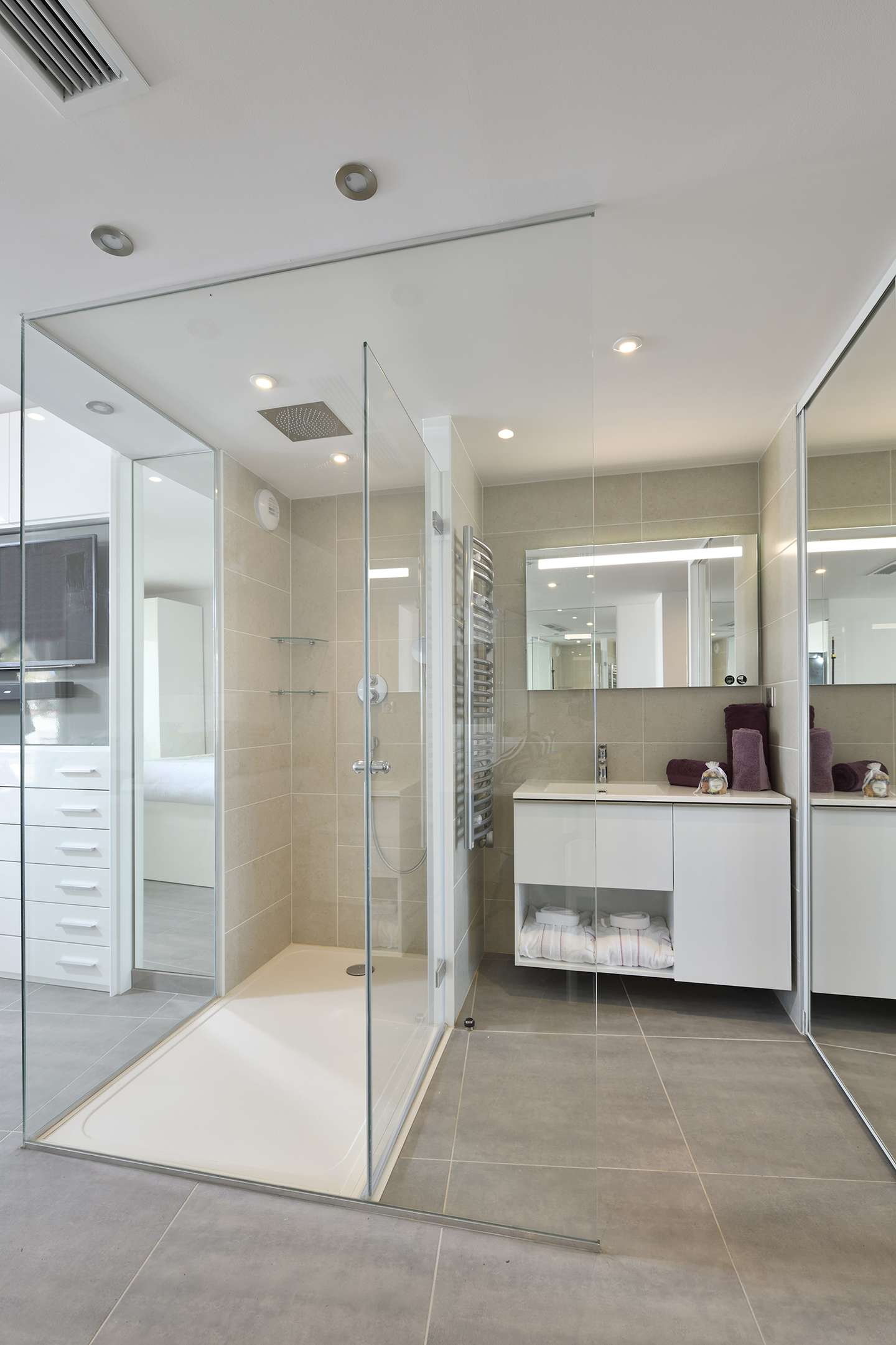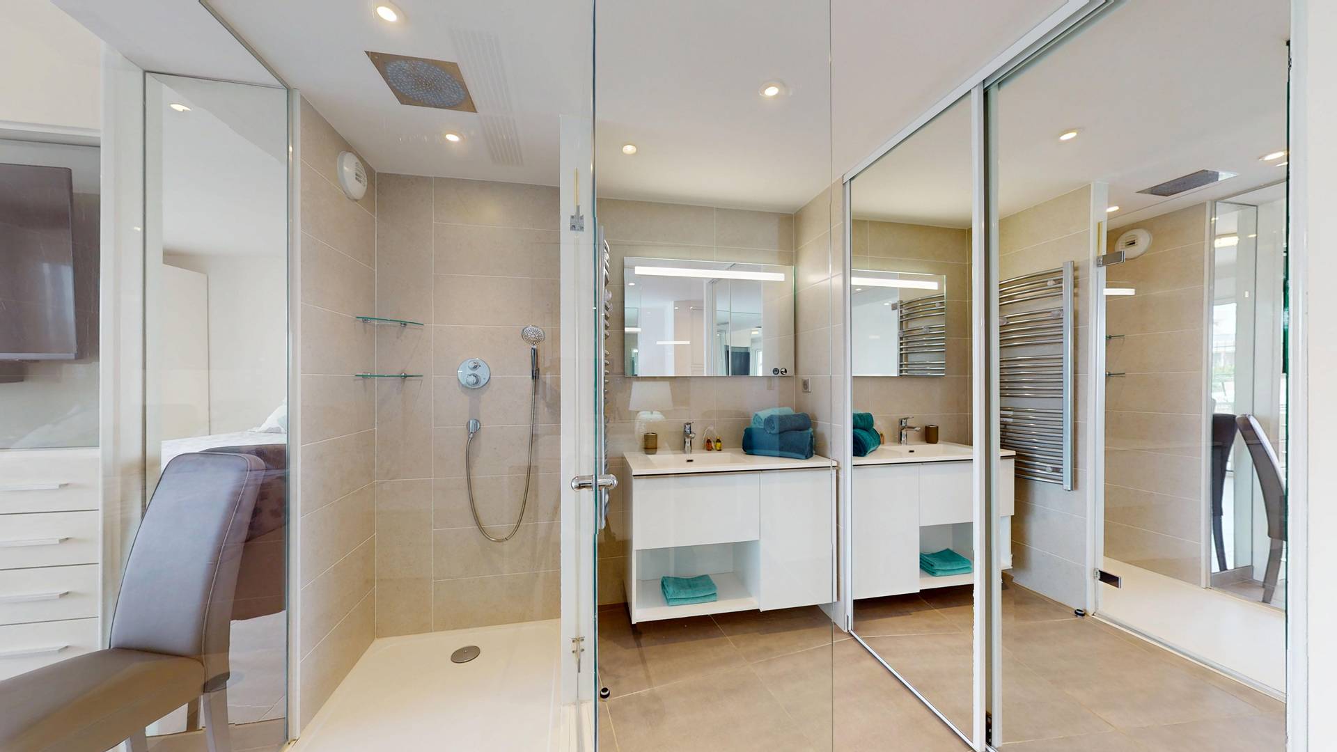 Bagno con ampia doccia a filo pavimento con soffione a pioggia e mobile lavabo.
