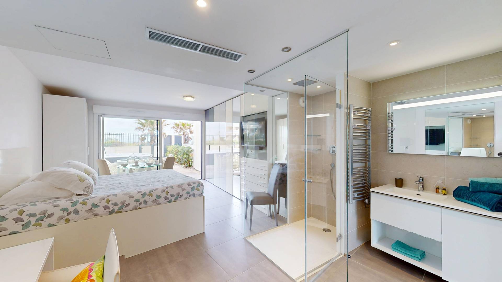 Suite climatizzata con zona notte dotata di letto da 180 cm, TV e cassaforte.