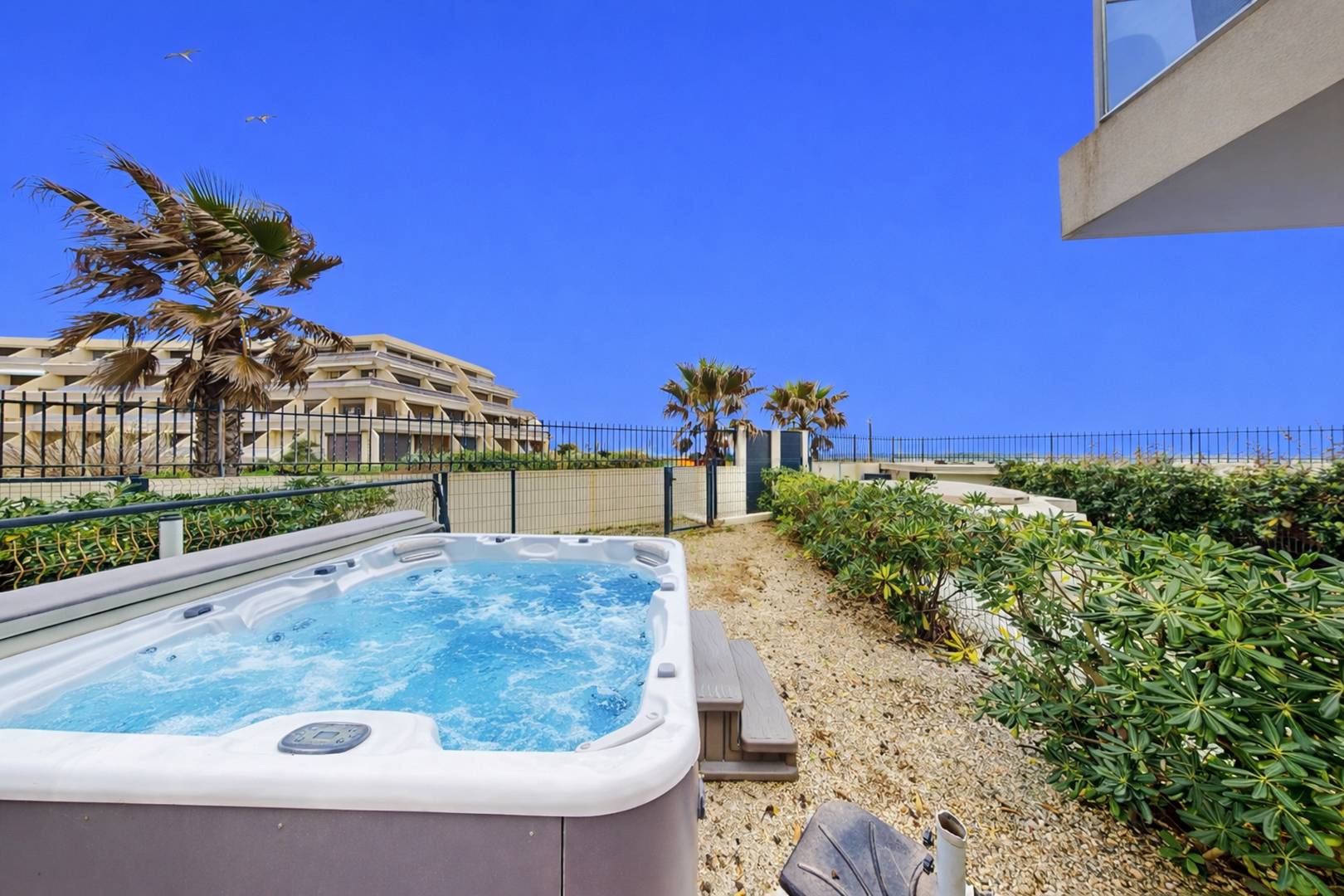 Bella terrazza con jacuzzi, salotto da esterno, lettini prendisole e ombrellone.