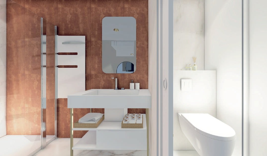 Bagno con doccia, mobile lavabo, asciugacapelli.